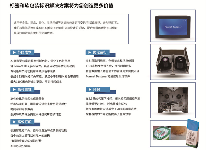 產(chǎn)品簡介:適用于食品、藥品、日化、生活用紙等各類軟包裝的可變碼(包括追溯碼、條形碼)打印。我們將降低總擁有成本(TCO)作為熱轉(zhuǎn)印打碼機(jī)設(shè)計(jì)的關(guān)鍵,配合原裝的碳帶可以保證最佳打印效果和更低的使用成本。